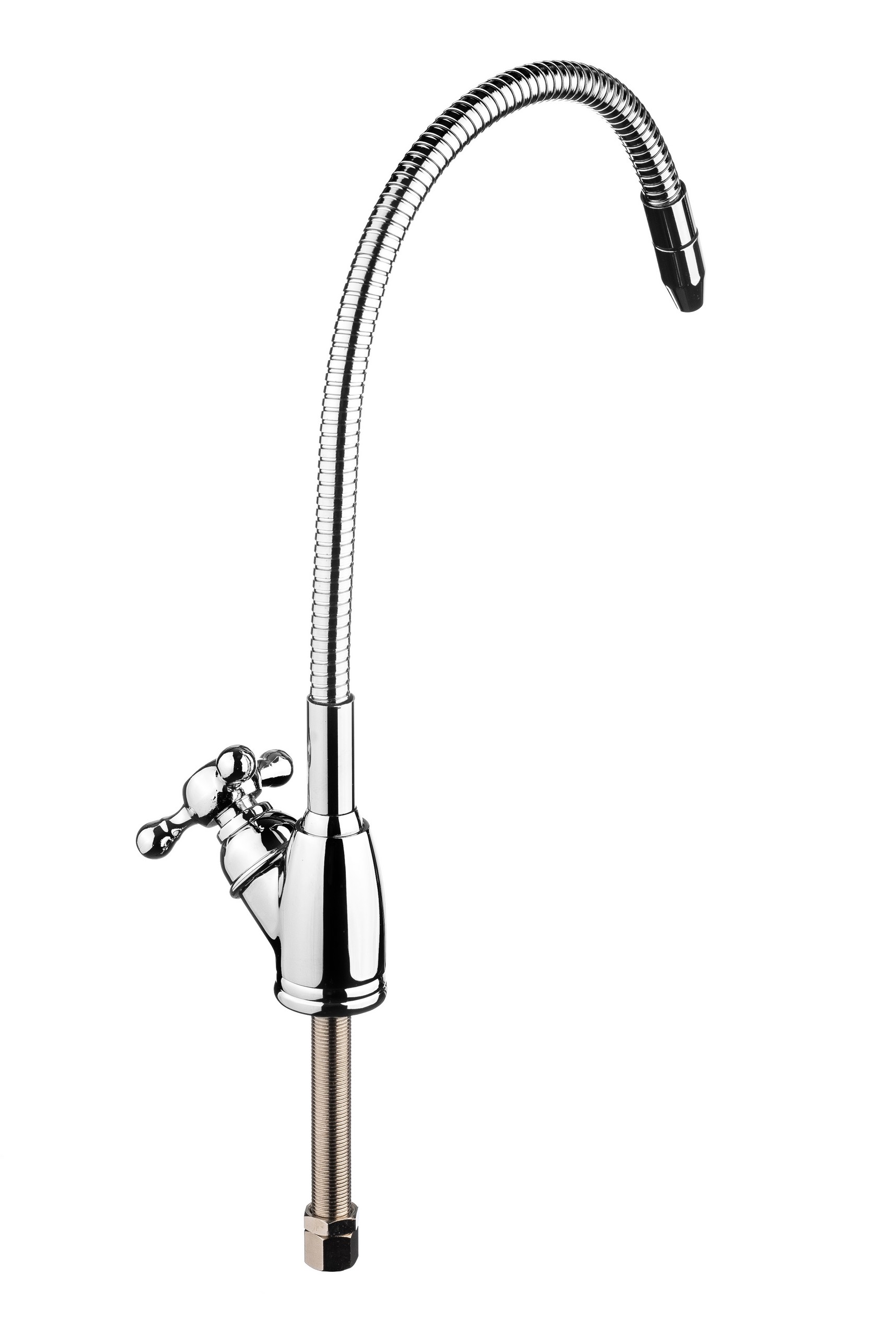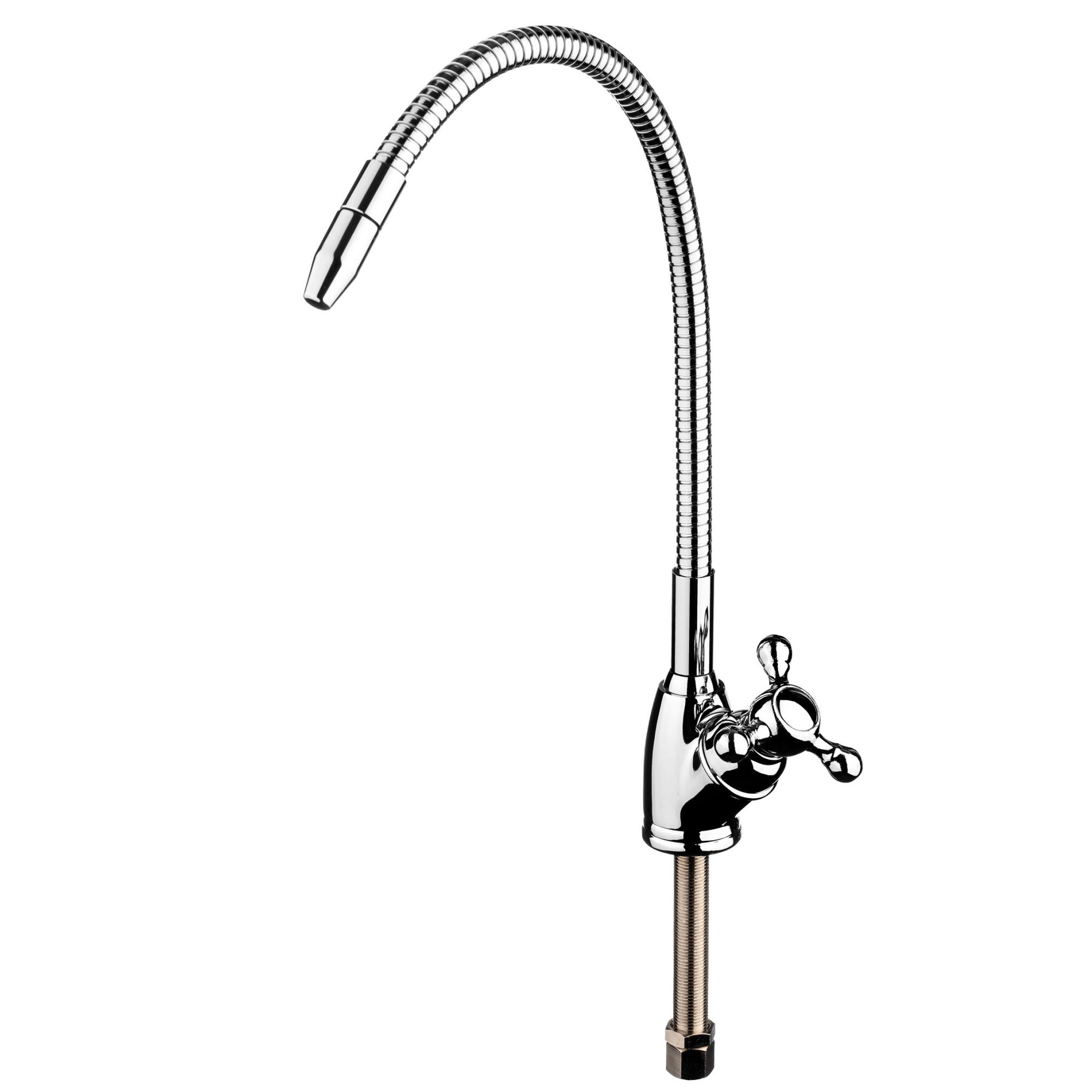 Кран изготовлен из современных экологически безопасных материалов с нанесением особо прочного хромированного покрытия и рассчитан на работу с холодной водой. Он устанавливается на мойку или столешницу в любом удобном для эксплуатации месте. Кран №8 предназначен для использования в бытовых системах фильтрации для подачи чистой воды. Гибкий излив в металлической оплетке позволяет изменять наклон крана для подачи воды.