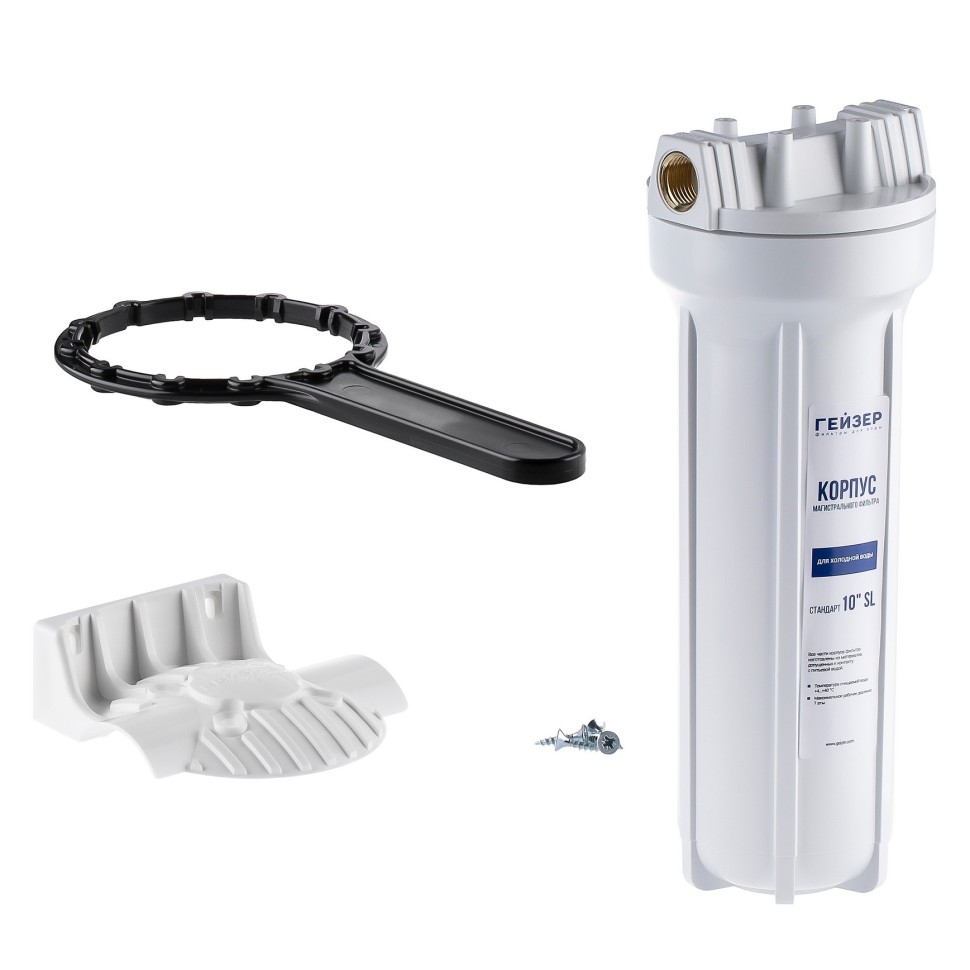 Корпус Гейзер 10SL с латунными вставками для холодной воды используется с картриджами стандарта Slim Line 10". Максимальное рабочее давление 7 атм. Максимальная рабочая температура 40°С. Присоединительный размер 1/2". Гарантия 5 лет. Производство Россия. Изготовлен из белого полипропилена с латунными вставками и пластмассовой скобой. Корпус рассчитан на работу под давлением и установку на входе в систему холодного водоснабжения. В производстве корпусов используется материалы пищевого класса.<br>