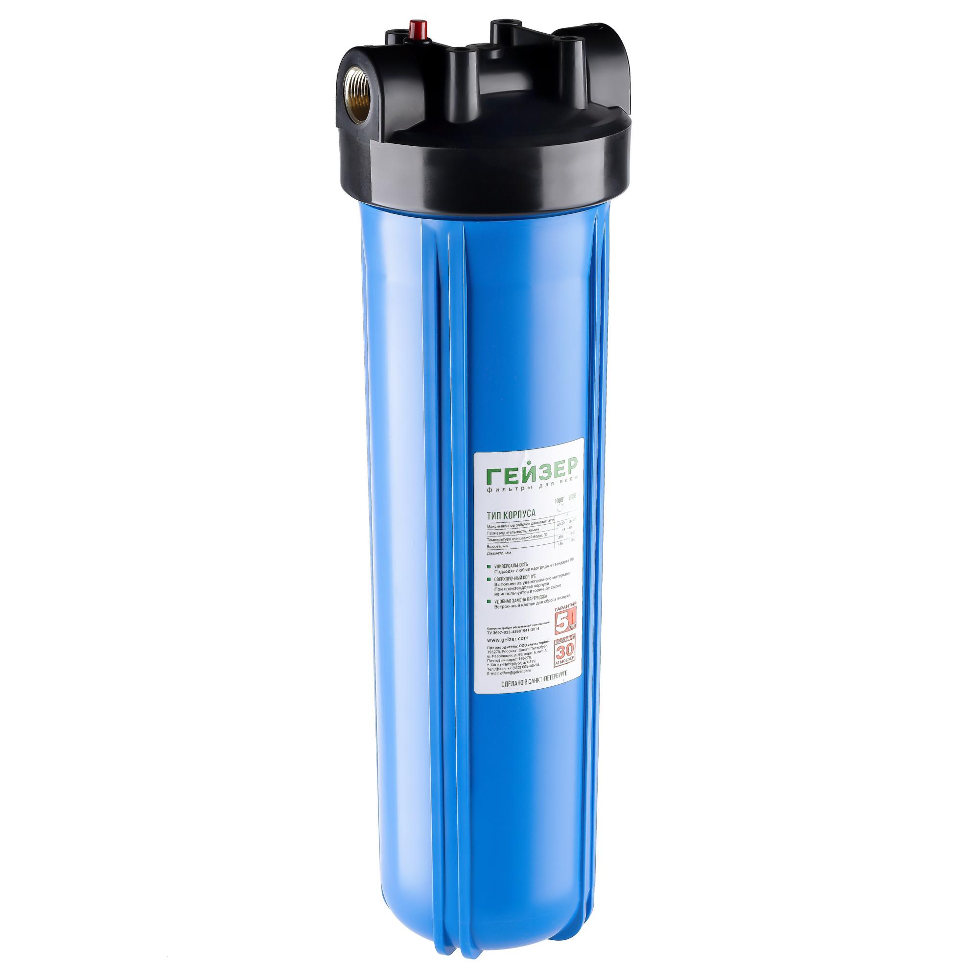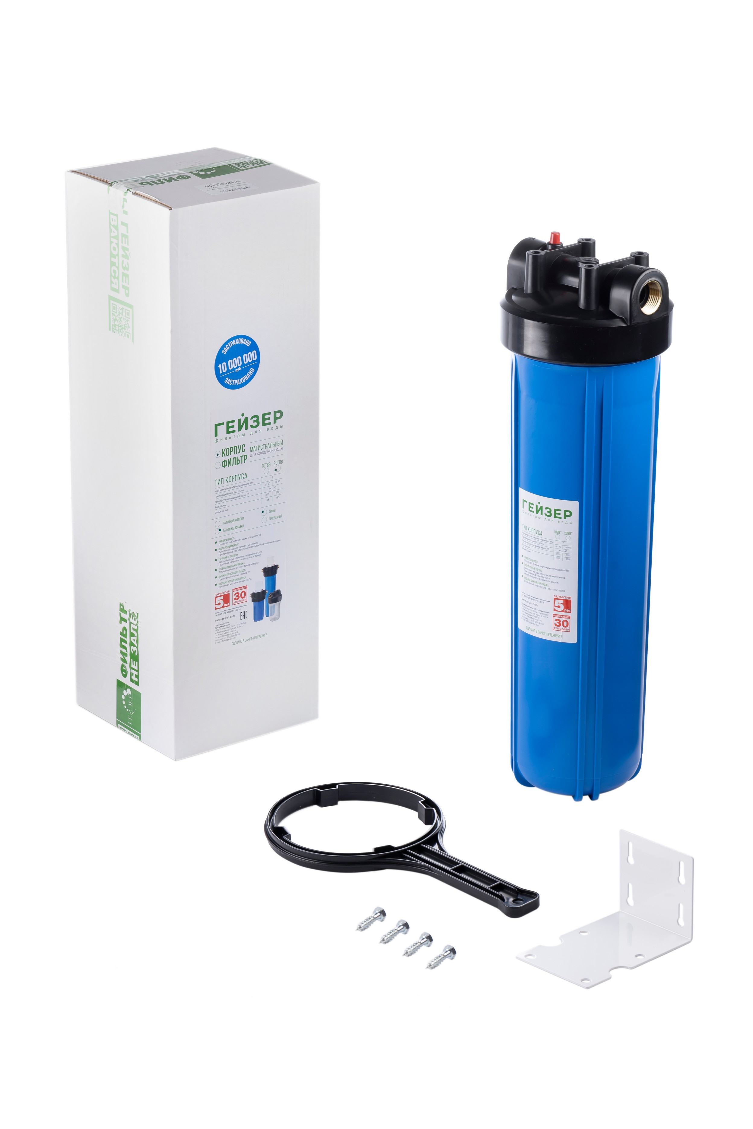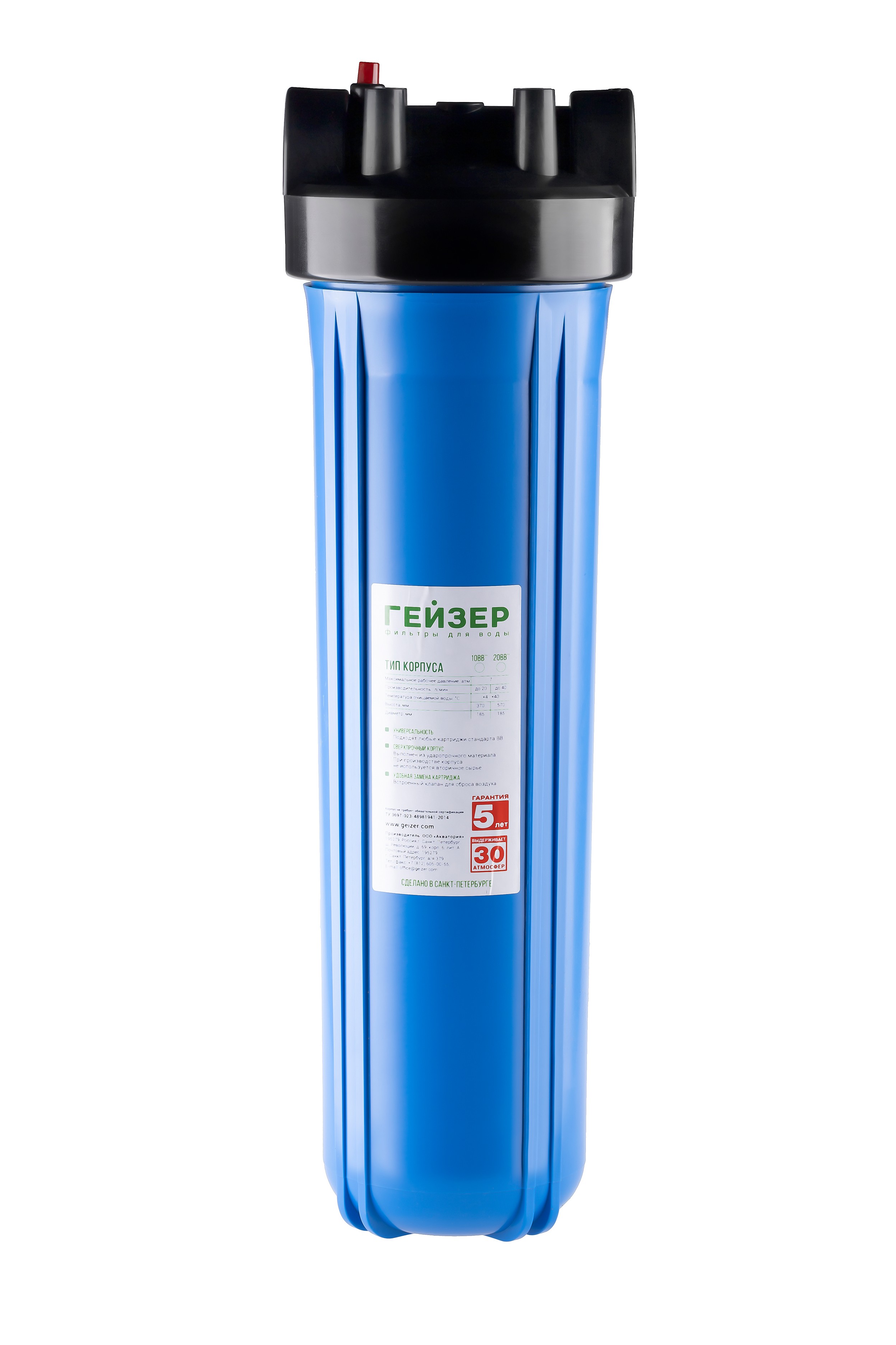 Корпус Гейзер 20BB с латунными вставками для холодной воды используется с картриджами стандарта Big Blue 20". Максимальное рабочее давление 7 атм. Максимальная рабочая температура 40°С. Присоединительный размер 1". Гарантия 5 лет. Производство Россия. Точеные латунные вставки в крышке корпуса увеличивают надежность и долговечность соединения при монтаже фильтра. Оснащен накидной гайкой на корпусе, которая значительно облегчает установку и замену картриджа стандарта 20ВВ. Более высокая производительность и ресурс за счет использования картриджей стандарта BB. Изготовлен из синего полипропилена. Крышка корпуса черный полипропилен, корпус рассчитан на работу под давлением и установку на входе в систему холодного водоснабжения. В производстве корпусов используется только первичное сырье пищевого класса.<br>