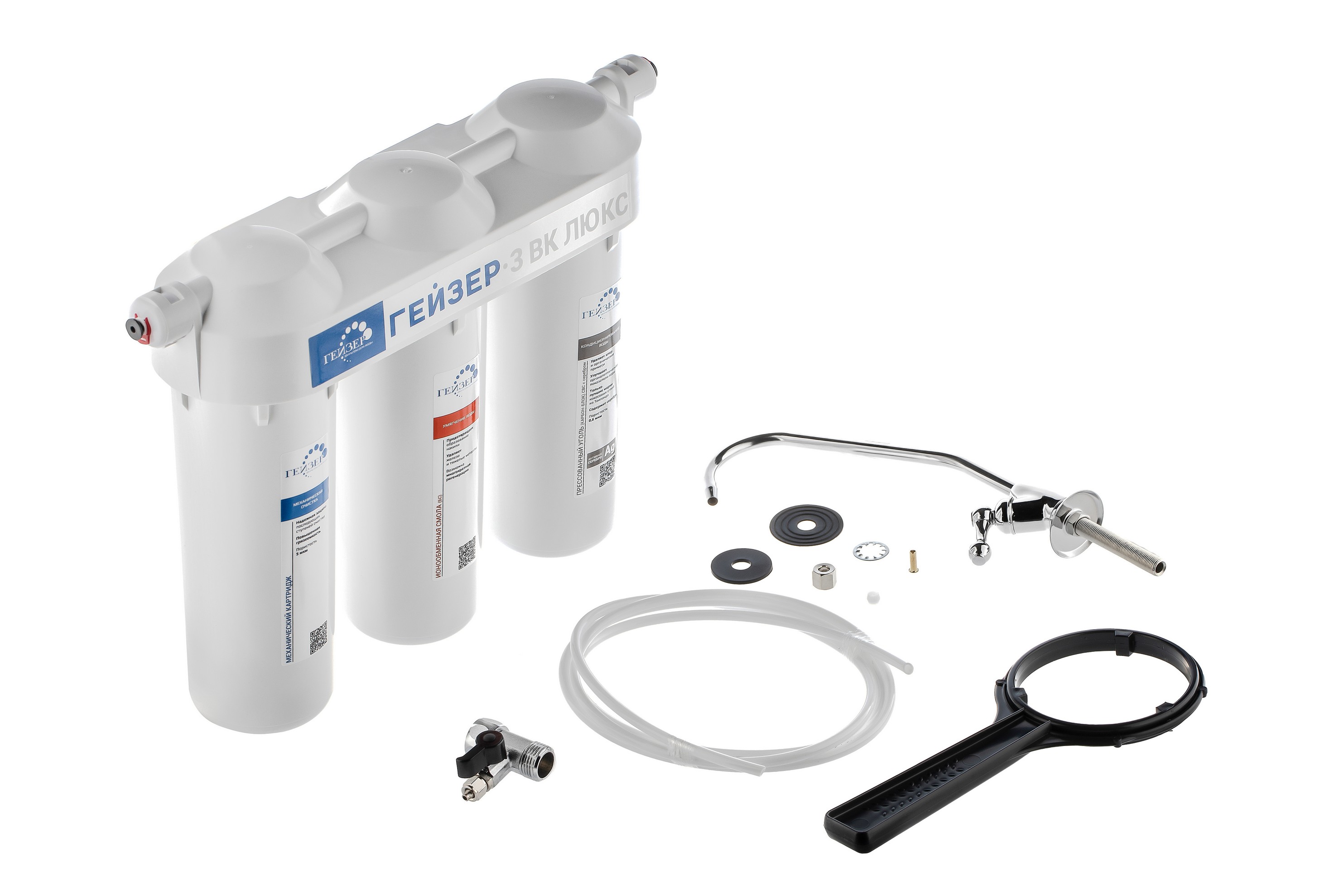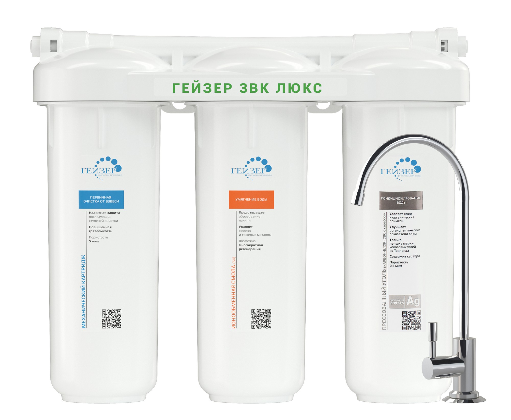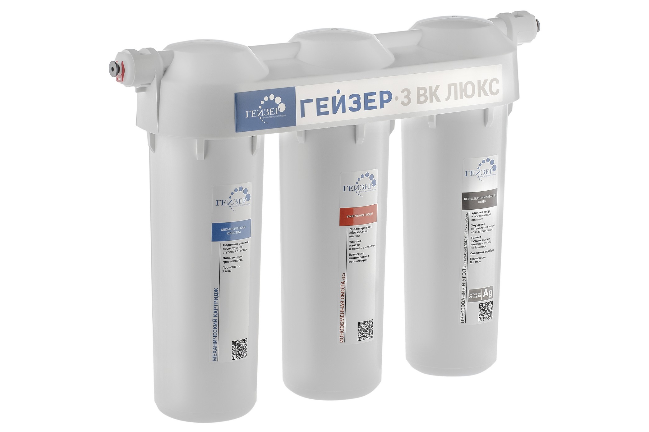 Бытовая система под мойку Гейзер 3 ИВ Люкс предназначена для очистки жесткой воды со средним уровнем минерализации. Она удаляет нерастворимые частицы, ржавчину, песок, ил, тяжелые и радиоактивные металлы, активный хлор, бактерии и вирусы, железо, органические соединения, канцерогены и пестициды. Система состоит из 3 ступеней: картридж PP 5/1, БС и картридж карбон-блок CBC. Она очищает воду 3 методами: механическая очистка, ионный обмен и сорбция. Система имеет барьерную функцию Антисброс, моноблок с двойным уплотнением колб. Замена картриджей для семьи из 3-4 человек 1 раз в год.<br>