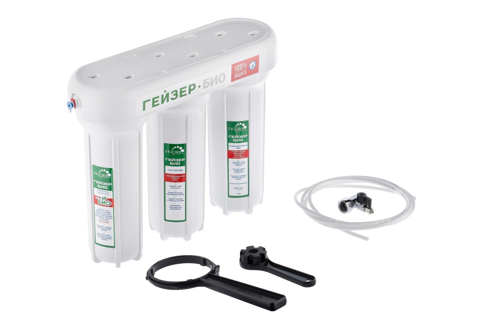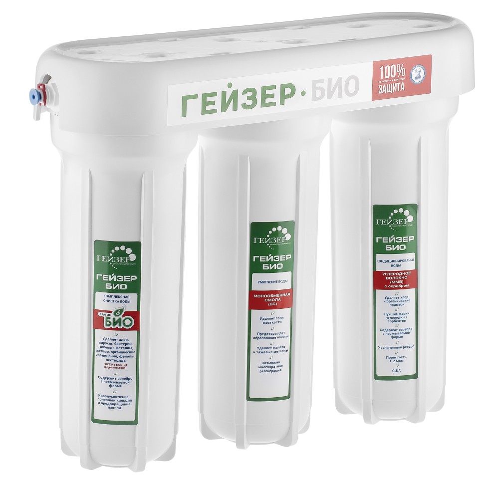 Бытовая система под мойку Гейзер Био 331 для сверхжесткой воды. Скорость фильтрации до 3 л/мин. Рабочее давление от 0,5 атм. Температура воды до 40 °С. Ресурс Арагон-2 БИО 7000 л. (с регенерацией до 25 000 л.).