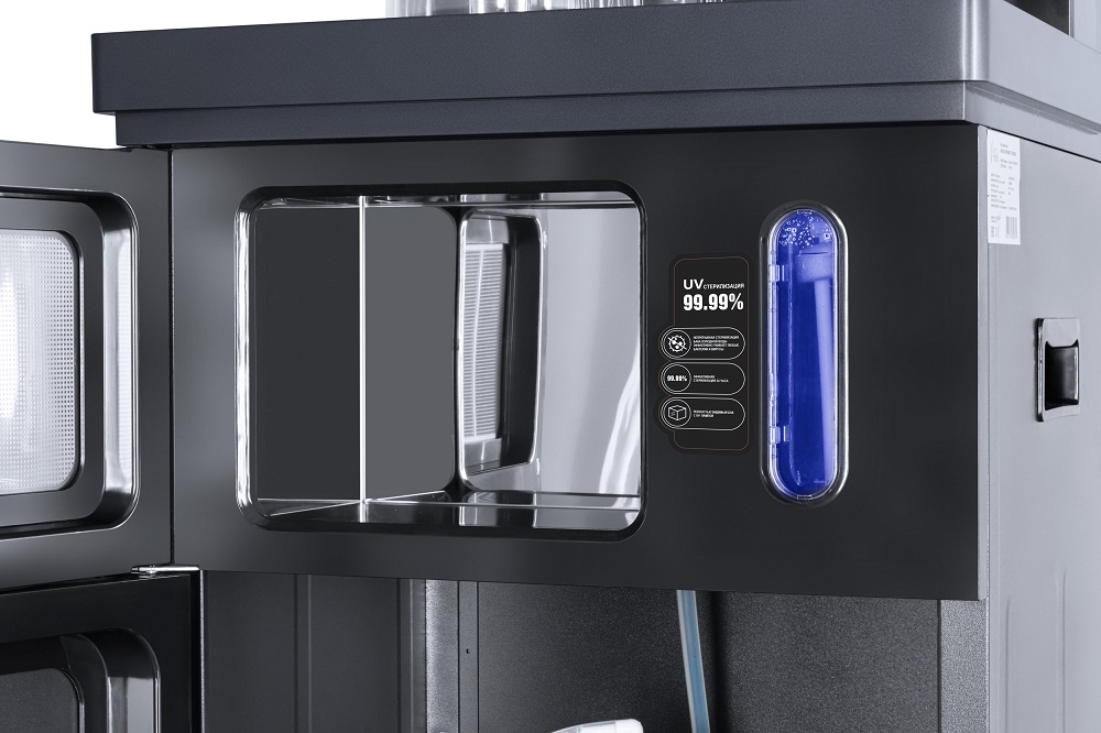 Функция стерилизации воды ультрафиолетом: в верхней части корпуса расположен накопительный бак на 2 л с установленной в нем UV-лампой. Лампа работает по схеме: первое включение функции - лампа работает 1 ч 45 мин., далее каждые 30 минут - автоматическое включение и отключение лампы.<br>