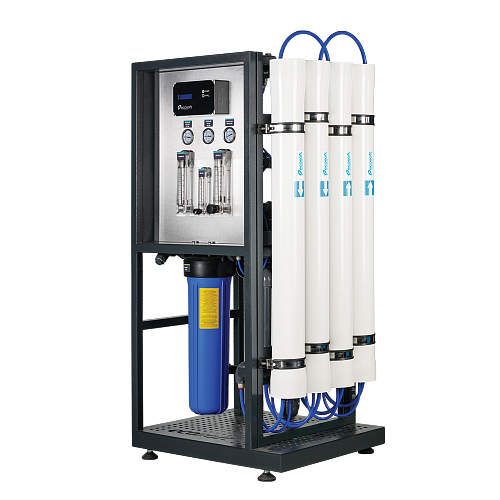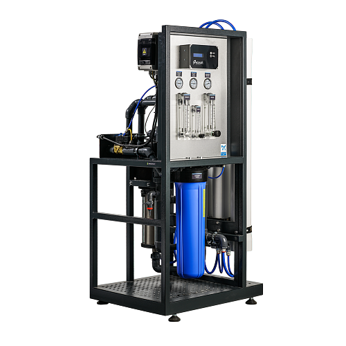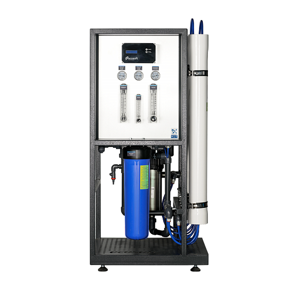 Коммерческая система обратного осмоса Ecosoft MO 24000 (без мембран) предназначена для очистки воды для парогенераторов, котлов, а также для небольших производств (кафе, фермы, мойки и др.). Фильтрацию осуществляют 4 мембраны (типа XLE-4040, в комплект не входят). Перед мембраной вода проходит предочистку. Предусмотрено дозирование антискаланта для предотвращения отложений внутри системы. Нужное давление воды достигается малошумным энергоэффективным насосом Grundfos. Управление и выдача информации осуществляется многофункциональным контроллером.