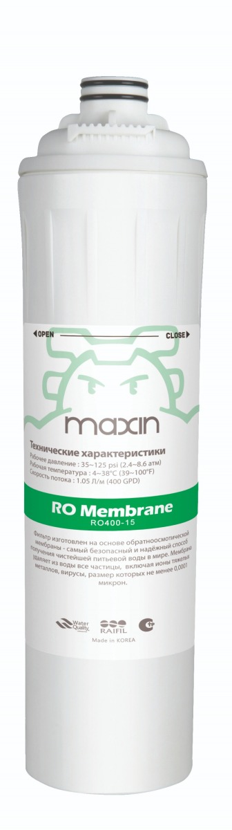 Обратноосмотическая мебрана Raifil MX-RO 400-15 предназначена для удаления из воды всех частиц, включая ионы тяжелых металлов, вирусы, размер которых не менее 0,0001 микрон. Мембрана применяется в прямоточных системах корейского производства Raifil RDR-400 MX. Она отличается высокой производительностью (1 литр в минуту), поэтому не требует накопительной емкости.<br>